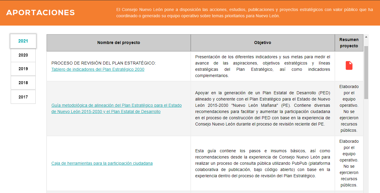 A través de este micrositio de transparencia proactiva podrán descargarse resultados de estudios, encuestas, mesas de diálogo, herramientas de participación ciudadana e información relevante sobre el proceso de revisión del Plan Estratégico 2030 Nuevo León Mañana.